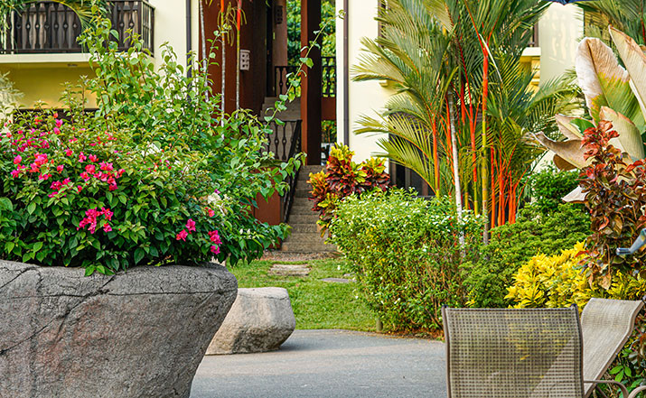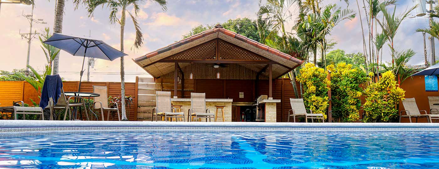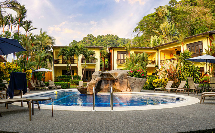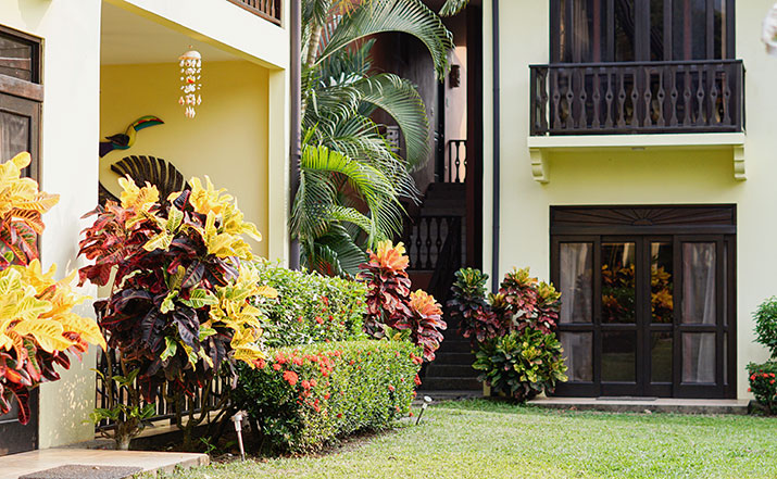 These luxurious two bedroom condominiums can accommodate up to six people. All condominiums are steps from the private swimming pool and waterfall. You will have an on-site office for check in/out, where we provide services for booking tours, transfers, fishing trips, and other activities. Daily maid service, full time maintenance, 24 hour security, cable TV, free wireless high speed Internet, and excellent air conditioning units. Kitchens are fully equipped for you to make your own meals and sit out on your private patio with your family dining. Washer and dryer units also are provided for your use. A Jenn-air BBQ grill is available at the pool-side area for our guests. Nestled in a beautifully lavished garden in the jungle within a small gated community of 17 gorgeous condominiums with 24 hour security. Best of all, the surfing beach is a block away from your front door.