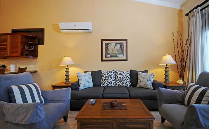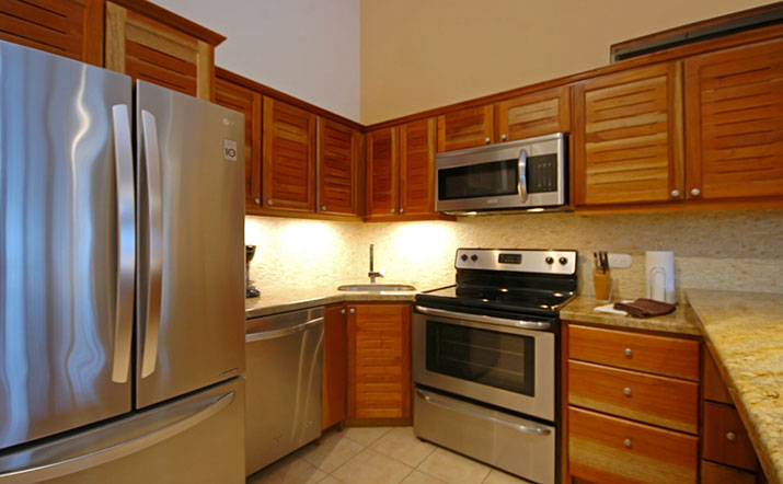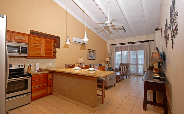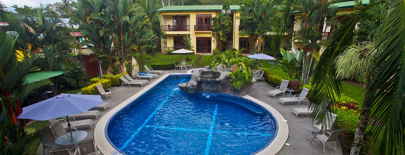 These luxurious two bedroom condominiums can accommodate up to six people. All condominiums are steps from the private swimming pool and waterfall. You will have an on-site office for check in/out, where we provide services for booking tours, transfers, fishing trips, and other activities. Daily maid service, full time maintenance, 24 hour security, cable TV, free wireless high speed Internet, and excellent air conditioning units. Kitchens are fully equipped for you to make your own meals and sit out on your private patio with your family dining. Washer and dryer units also are provided for your use. A Jenn-air BBQ grill is available at the pool-side area for our guests. Nestled in a beautifully lavished garden in the jungle within a small gated community of 17 gorgeous condominiums with 24 hour security. Best of all, the surfing beach is a block away from your front door.