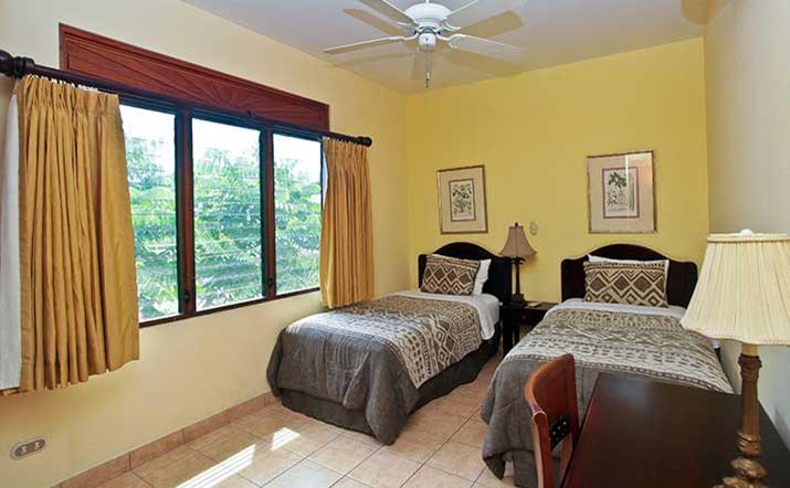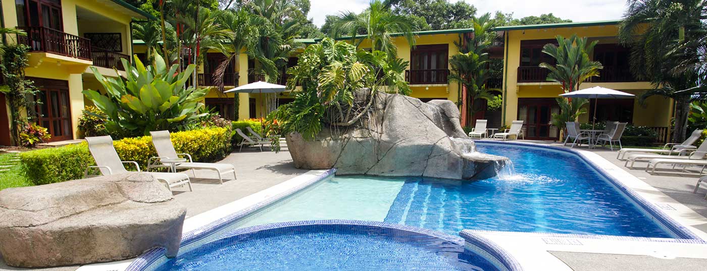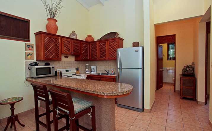 These luxurious two bedroom condominiums can accommodate up to six people. All condominiums are steps from the private swimming pool and waterfall. You will have an on-site office for check in/out, where we provide services for booking tours, transfers, fishing trips, and other activities. Daily maid service, full time maintenance, 24 hour security, cable TV, free wireless high speed Internet, and excellent air conditioning units. Kitchens are fully equipped for you to make your own meals and sit out on your private patio with your family dining. Washer and dryer units also are provided for your use. A Jenn-air BBQ grill is available at the pool-side area for our guests. Nestled in a beautifully lavished garden in the jungle within a small gated community of 17 gorgeous condominiums with 24 hour security. Best of all, the surfing beach is a block away from your front door.