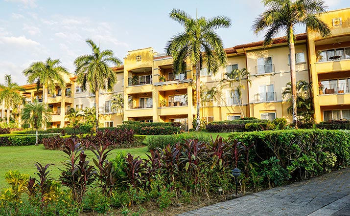 The Del Mar Condominiums feature a striking contrast between Mediterranean architectural design and the delicate landscape that characterizes this community. Del Mar is a haven for recreation and active living within Los Suenos.