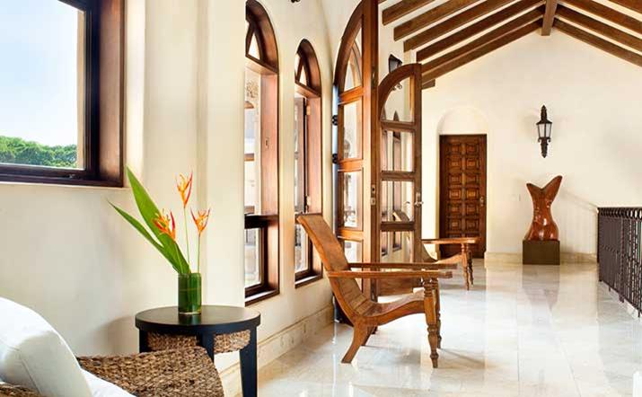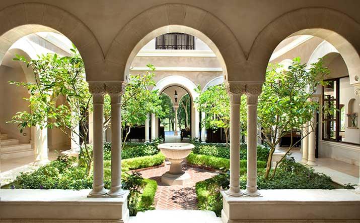 The rooms are located around a magnificent, fountained interior central courtyard and garden. On the first floor are the living room, library, dining room, and gourmet kitchen surrounding the interior gardens. Two of the four master bedrooms are on the first floor and two are on the second floor. There is a small separately located fifth bedroom and bath perfect for one person (perhaps a teen family member or staff person).