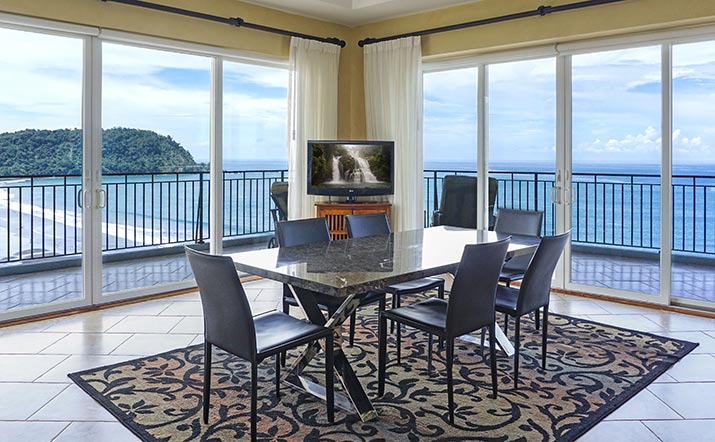 The living room-dining room-kitchen has an open floor plan with floor-to-ceiling windows with spectacular views of the Pacific Ocean, from one end of Jaco Beach to the other plus the rainforest. Don't miss anything... the great room is equipped with two flat panel televisions! The chef's kitchen is fully-outfitted for entertaining, including two commercial refrigerators.